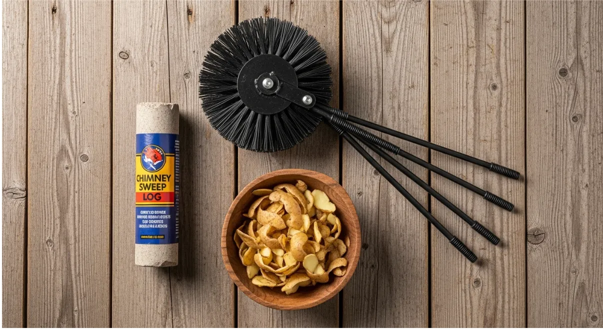 - Как почистить трубу дымохода: Механически (щетка, ерш), химически (полено-трубочист) или народными средствами (картофельные очистки)